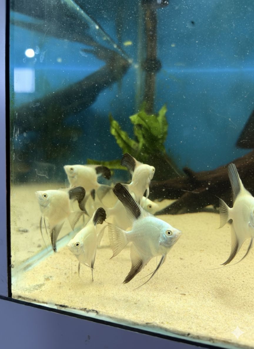The Bulgarian Seal Point Angelfish is a striking angelfish variety with a pale, almost silvery-white body and sharply contrasting dark black points on its fins (especially dorsal and ventral). It typically has red or bright eyes and minimal to no vertical bar markings. This angelfish is a result of selective breeding and is prized for its unique look and rarity in the hobby.