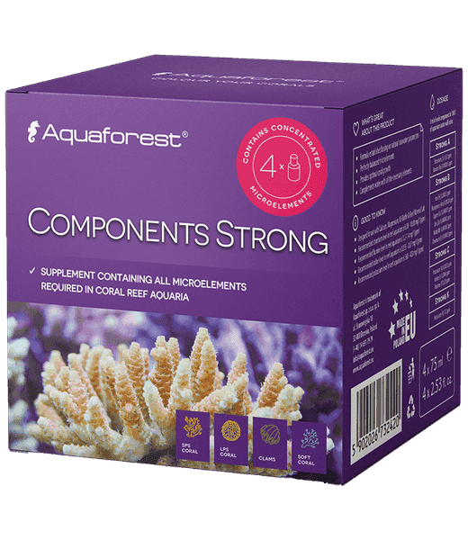 Components Strong contains concentrated trace elements intended for use in reef aquariums. Components Strong in combination with Calcium, Magnesium, KH Buffer and Reef Mineral Salt are a complete set designed to maintain a reef aquarium by the method proposed by H. W. Balling, therefore these products should be used in parallel. Due to the fact that the microelements in the aquarium are consumed in the right proportion with the macroelements, the concentrations of Components Strong have been developed based on other values. Only the use of the entire range of Aquaforest products ensures effectiveness and guarantees the chemical balance in the aquarium. The amount of microelements fed depends on the individual needs of the aquarium for magnesium and calcium.