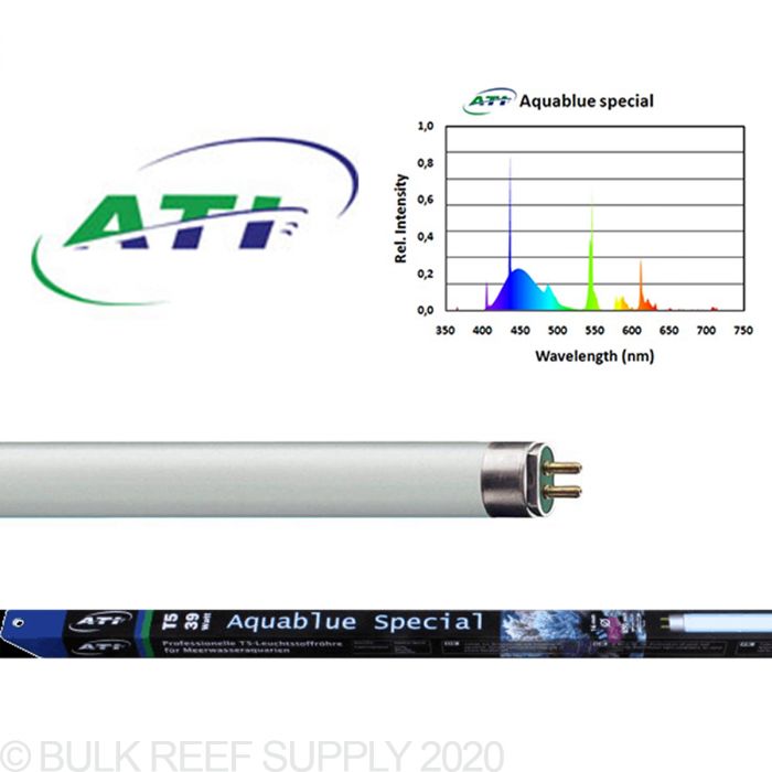 The ATI AquaBlue Special combines the properties of a blue bulb and full spectrum daylight bulb producing a color temperature of approximately 12000K. Great as a stand-alone bulb or in combination with an ATI Blue Plus or an ATI True Actinic 03