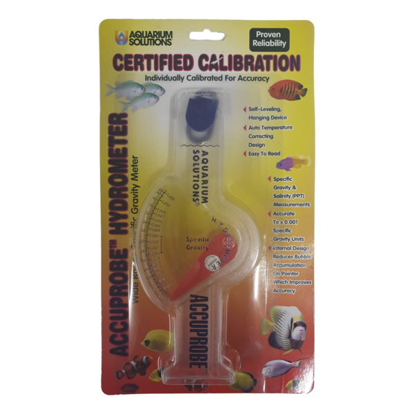 Hikari Accuprobe Hydrometer provides certified calibration of a wide range specific gravity meter. This self-leveling, hanging device features an auto temperature correcting design and is easy to read.