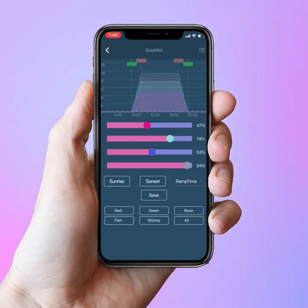 Perfect choice for high-tech aquariums, even with the most demanding plants. With the help of the built-in Bluetooth controller and the My Chihiros application you can change the color and brightness of the light to your liking so you can easily achieve the perfect look for your own taste. You can even set sunrise and sunset with a few clicks in the app which is not only cool but also better for your fish than suddenly turning the light on or off.