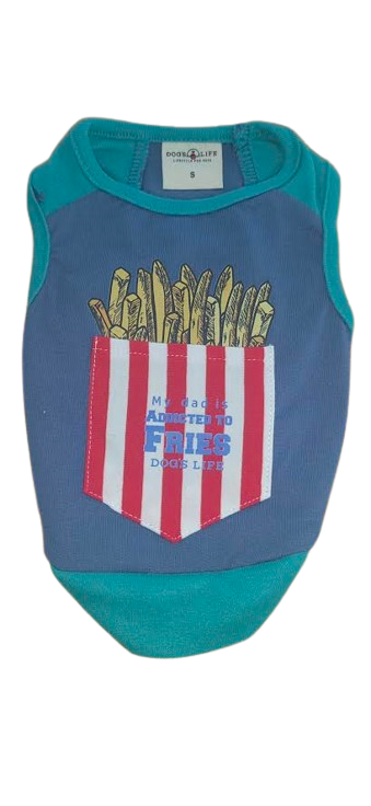 Introducing the My Dad is Addicted to Fries Doggy Tee – perfect for the pup whose human just can’t resist a basket of fries! This adorable and stylish tee features a playful design with a pocket on the front, screenprinted with french fries, adding a fun, food-loving twist.