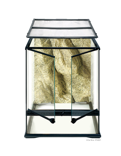 The Exo Terra Glass Terrarium is the ideal reptile or amphibian housing designed by European herpetologists. The front opening doors allow easy access for maintenance and feeding. A specially designed lock will prevent escape and the doors can be opened separately. The full screen top ventilation allows UVB and infrared penetration, and is completely removable for easy access while decorating or cleaning. In the back of the screen cover are 5 closable wire or tube inlets on both sides to install Heat Wave Rocks, Waterfalls, sensors, etc. inside the terrarium. The bottom plate of the terrarium is raised to mount a substrate heater to heat a part of the extended ground surface. The extra high fixed front window is ideal for thick layers of substrates (burrowing reptiles), aquatic parts (paludarium) or to mount an Exo Terra reptile den. The natural background is in the same colour like all other Exo Terra decoration items (Water Dishes, Waterfalls, Heat Wave Rocks, etc.) and provides an extra climbing dimension.