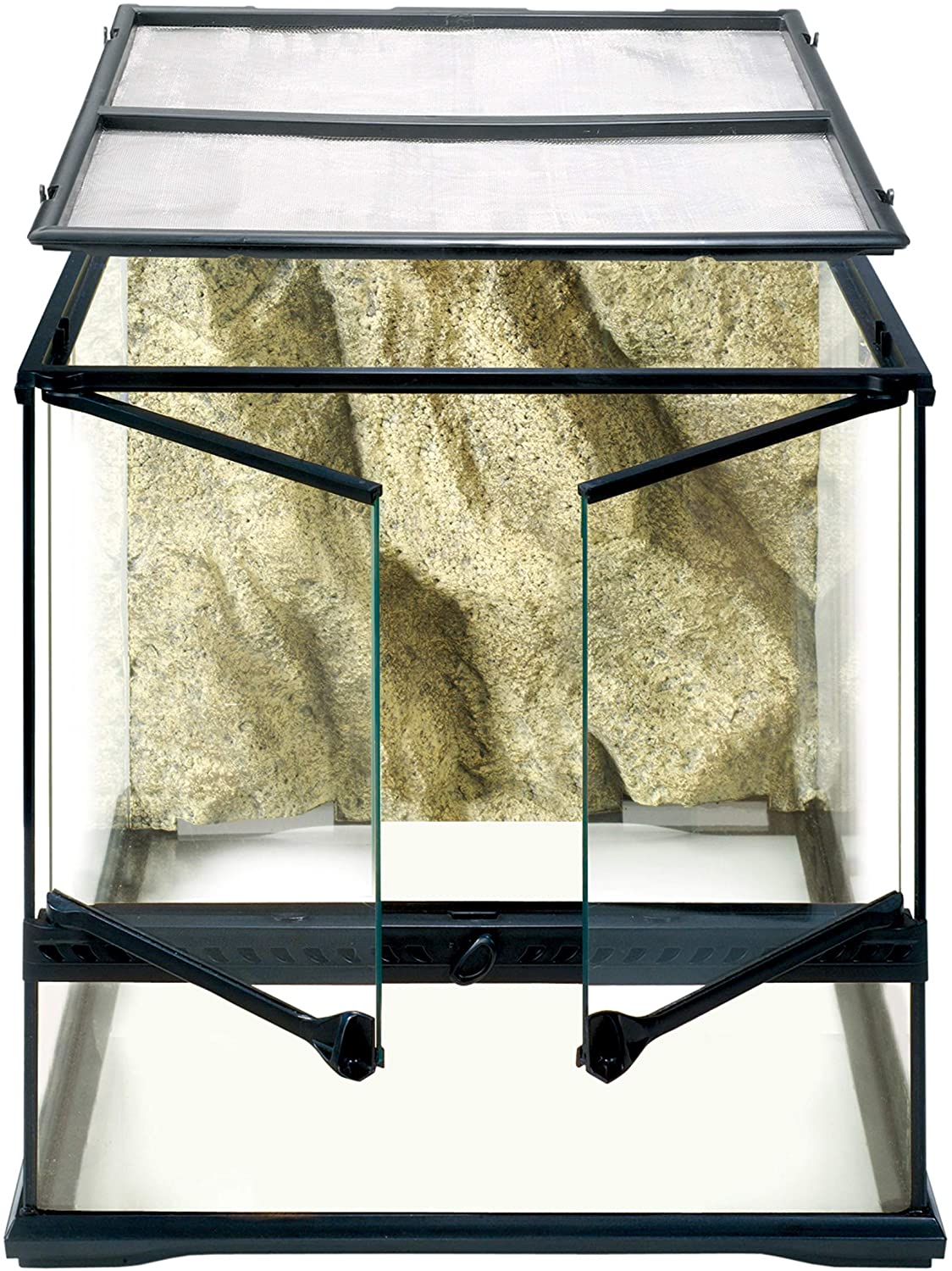 The Exo Terra Glass Terrarium is the ideal reptile or amphibian housing designed by European herpetologists. The front opening doors allow easy access for maintenance and feeding. A specially designed lock will prevent escape and the doors can be opened separately. The full screen top ventilation allows UVB and infrared penetration, and is completely removable for easy access while decorating or cleaning. In the back of the screen cover are 5 closable wire or tube inlets on both sides to install Heat Wave Rocks, Waterfalls, sensors, etc. inside the terrarium. The bottom plate of the terrarium is raised to mount a substrate heater to heat a part of the extended ground surface. The extra high fixed front window is ideal for thick layers of substrates (burrowing reptiles), aquatic parts (paludarium) or to mount an Exo Terra reptile den. The natural background is in the same colour like all other Exo Terra decoration items (Water Dishes, Waterfalls, Heat Wave Rocks, etc.) and provides an extra climbing dimension.