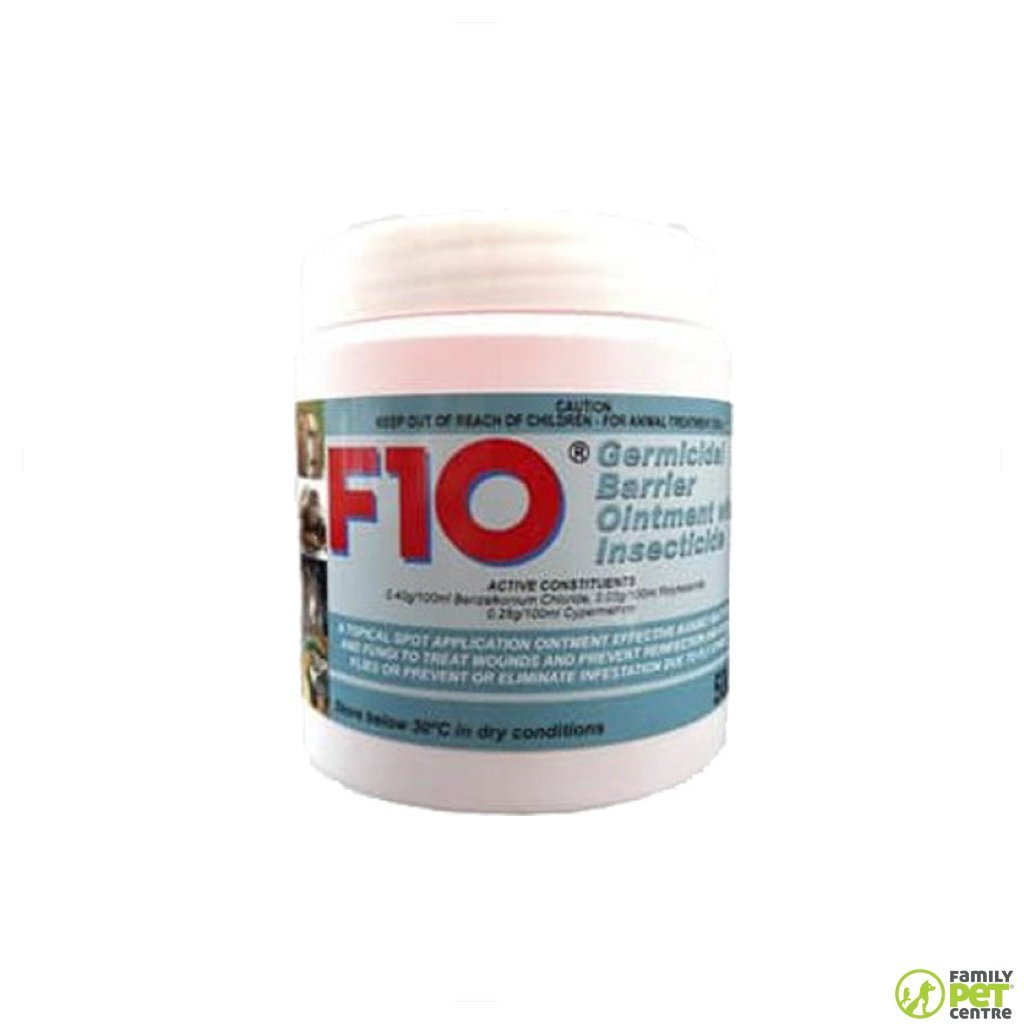 F10 germicidal barrier ointment with insecticide is a topical spot application ointment effective against bacteria and fungi suitable for the treatment of wounds. It prevents re-infection, repels flies and eliminates infestation due to fly strike on cattle, sheep, dogs and horses.