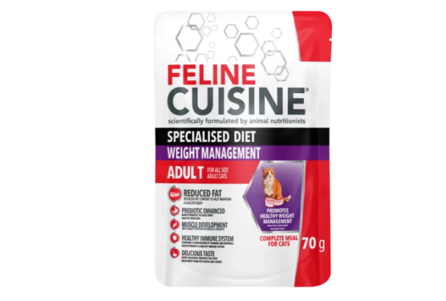 Feline cuisine Specialised Diet, Weight Management is available in a delicious wet food. It is suitable for all size adult cats. It promotes healthy weight management and is made with fresh meat that adds to a delicious taste. It is a complete meal for cats. Size: 70 g pouch Benefits: Reduced fat: reduced fat content to help maintain a healthy body. Prebiotic enhanced: added prebiotic to assist with healthy digestion. Muscle development: with quality protein for muscle strength. H