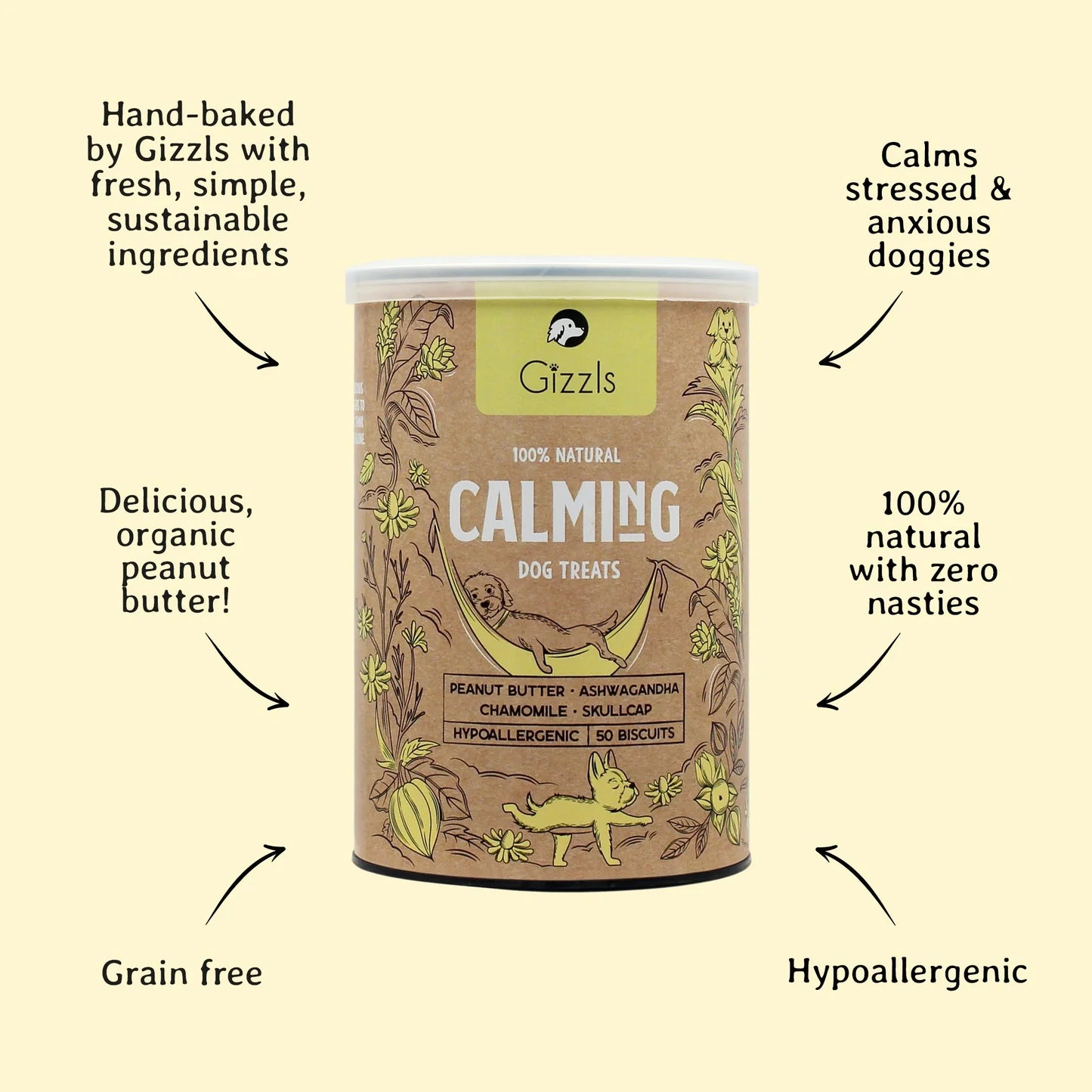 The perfect 100% natural treat* to help calm stressed and anxious doggies. A delicious peanut butter biscuit packed with our unique blend of adaptogens and superfoods to help reduce stress responses in the mind and body. Think vet trips, fireworks, thunderstorms, aggressive behaviour or being home alone.
