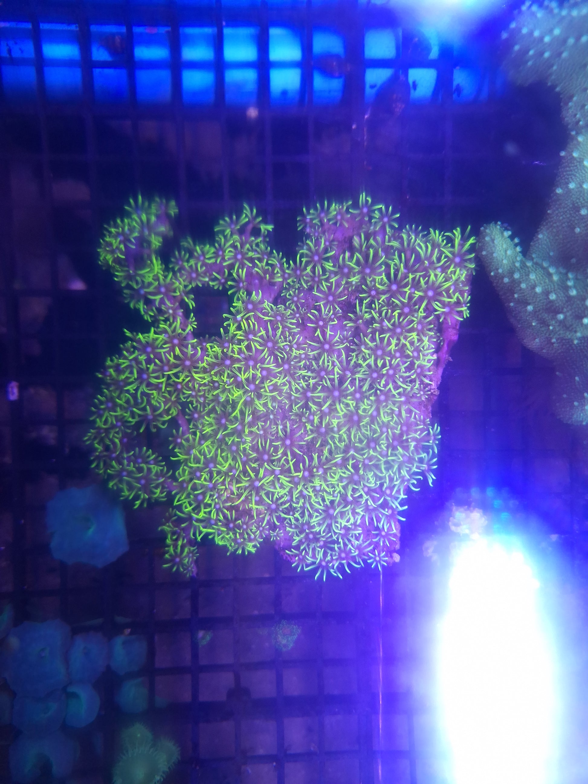Green Star Polyps (Pachyclavularia violacea) are a fast-growing, hardy soft coral known for their vibrant neon green polyps and waving grass-like appearance. When fully extended, they resemble a lush field of green under flowing water—making them a striking and dynamic addition to any reef tank.