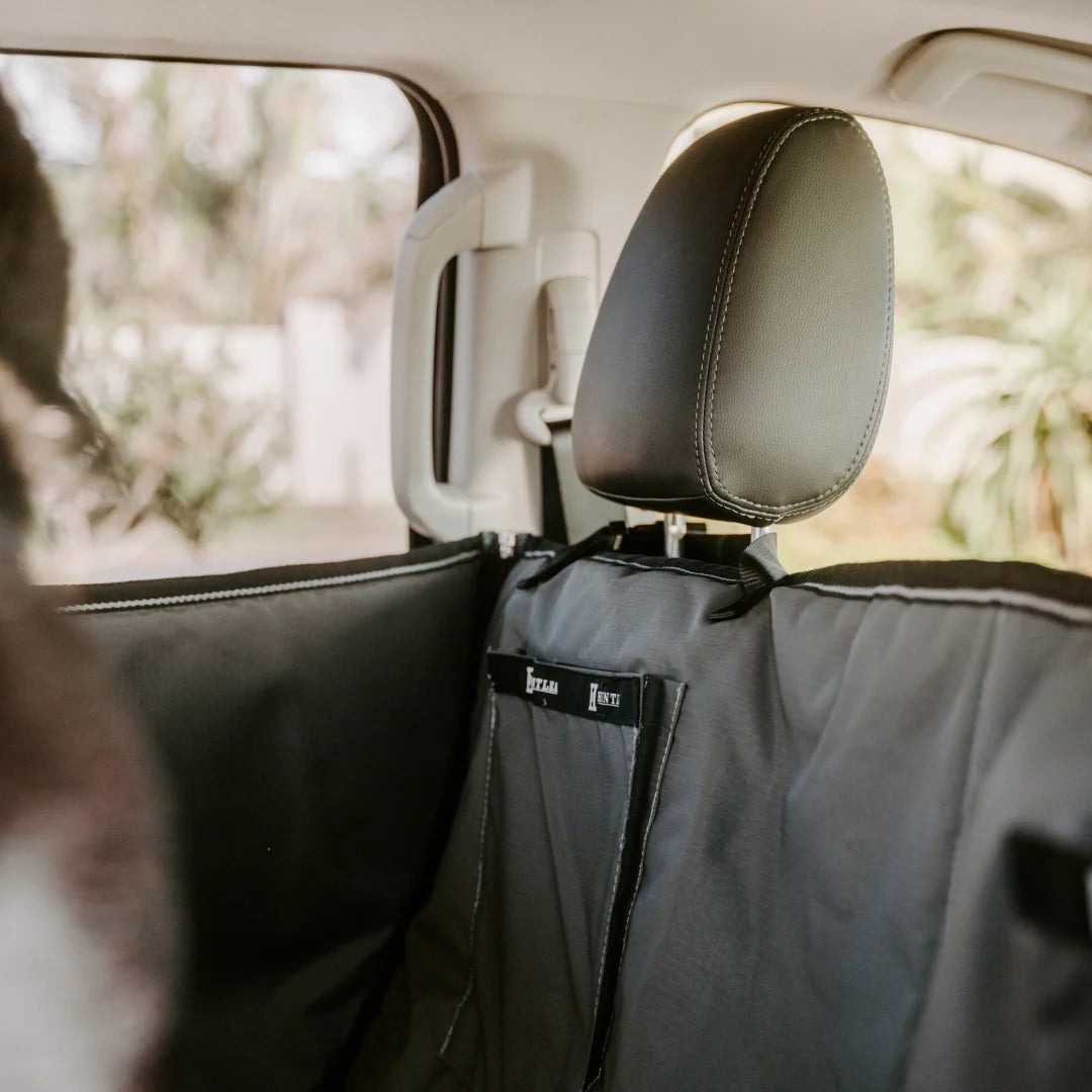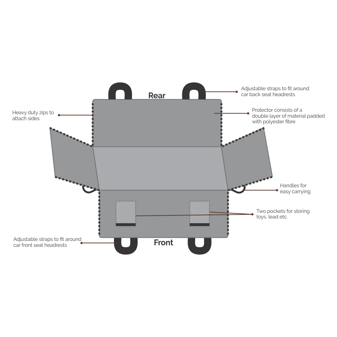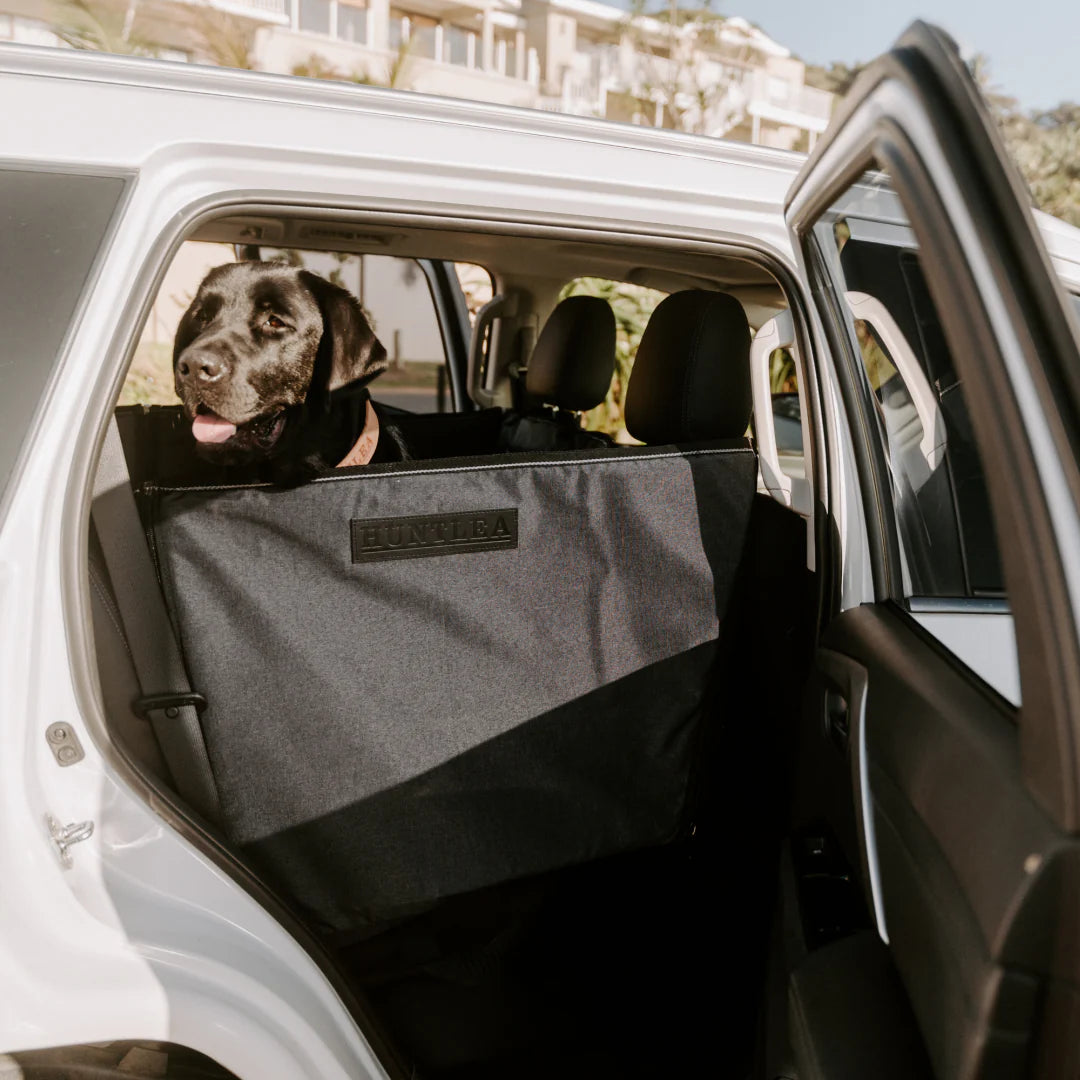 Huntlea Delux back seat car cover is a necessity for anyone travelling with their furry friends. This back seat cover protects your seats and car door panels from dirty, muddy and damp paws. The inside is Riptec material and the outside is a cationic material with a layer of padding inbetween to keep your dog comfortable and your seats clean. The Riptec top is waterproof,extremely durable and easy to keep clean. Heavy duty zips are used for the zip up side panels as well as durable webbing straps and adjustable clips hook around the front and back head rests to creat a hammock like effect in the back seat of your car. Unzip the side pane and fold it down to allow your pet easy access into the back seat whilst protecting your car from sharp claws whilst climbing in. The cover has two large pockets sewn in to store all your necessary pet items. The cover folds up to fit into a neat storage cover provided. This doubles up as a sleeping mat for your dog or picnic blanket.