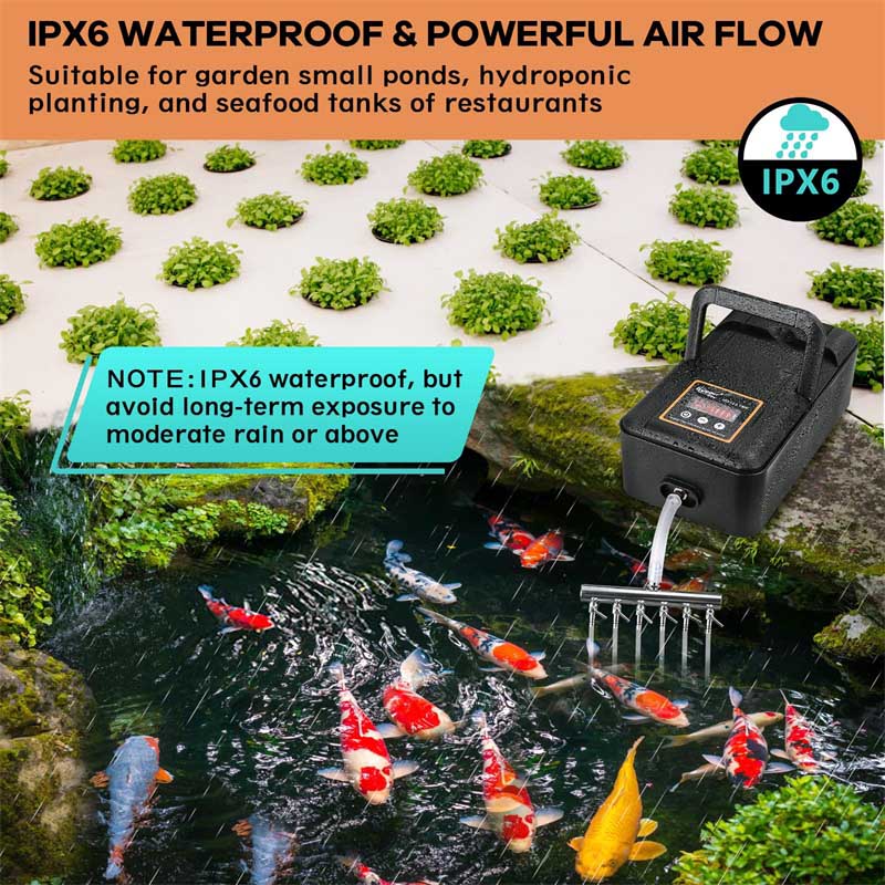 The adjustable aquarium aerator pump can be used outdoors in rainy weather. But avoid long-term exposure to moderate rain or above to prevent the built-in circuit and lithium battery from being damaged by water vapor. The Air pump has an adjustable airflow button with 9 stages. The 18W pump is also equipped with a divert valve to adjust the flow and close part of the air outlet.