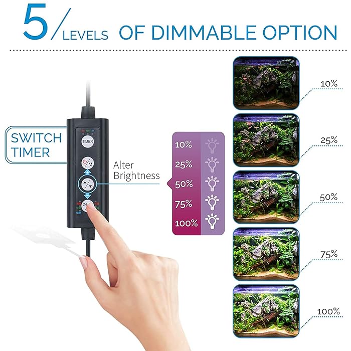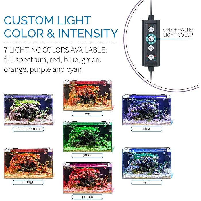 - DIY MODE: Full spectrum aquarium light also can change the time + brightness + color. ①Setting time(TIMER key): 3 kinds of time, 6h, or 10h, or 12h; ②Brightness(🔺/🔻 key): 5 kinds of brightness. ③Color(ON-OFF/ M key): White, Red, Blue, Green, Purple, Orange, Cyan, Cycle Color.