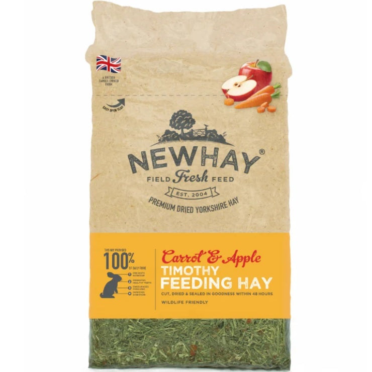 Produced The Newhay Way™,this premium Timothy Hay with added Carrot and Apple is highly palatable, nutritionally robust, quality assured feeding hay that small animals find delicious. Baled within 48 hours of cutting to maintain the nutrition nature intended, and processed to reduce harmful dust and bacteria to ensure premium quality in every bite. This is perfect food for pet rabbits, guinea pigs, chinchillas and other small pets.