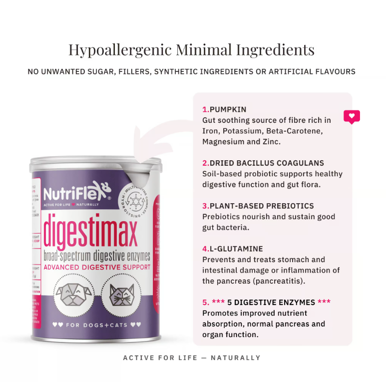 Fortunately, DigestiMax digestive enzymes help to break down food into a more digestible form for better nutrient absorption. By improving nutrient absorption, DigestiMax ensures your pet derives the full nutritional value from their meals, especially from heat-processed foods such as kibble that usually lack enzymes lost in manufacturing.
