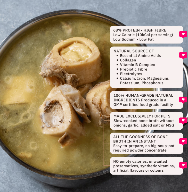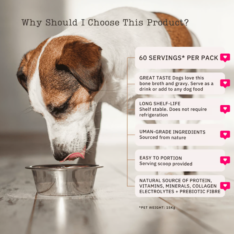Our human-grade instant beef bone broth is a nutrient-dense superfood for dogs. Packed with collagen protein, essential amino acids, vitamins, and minerals, it promotes gut health, enhances joint strength, and improves skin and coat health. Ideal for picky eaters, it enriches the flavour of any meal, making it both a treat and a health boost.