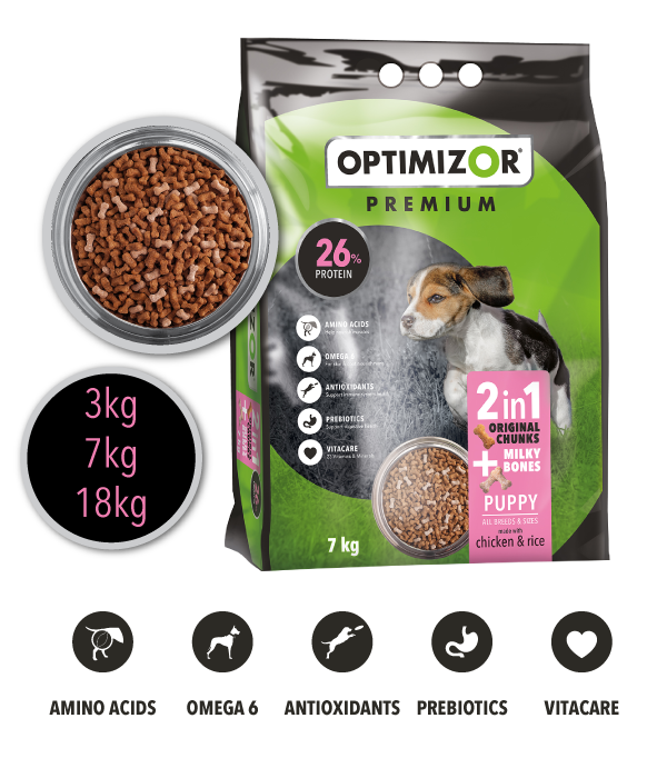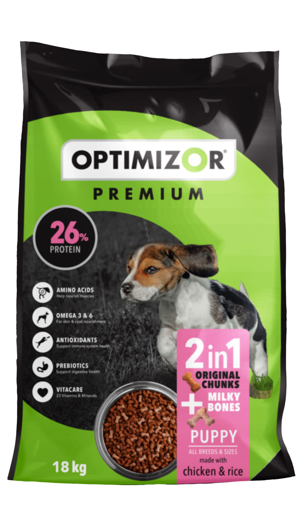 Optimizor Premium Puppy with Milky Bones contains 26% protein and easily digestible milk proteins for development and growth. The inclusion of easy-to-digest milk proteins in our kibble means that we can offer increased calcium in the form of ‘milky bones’ in our puppy food. Together with VitaCARE, and Omega 3 and 6, Optimizor Premium Puppy has everything your puppy needs for healthy growth and development.