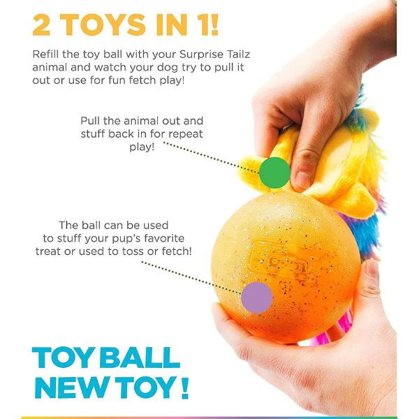 - 2 TOYS IN 1: Refill the toy ball with your Surprise Tailz animal and watch your dog try to pull it out or use for fun fetch play!