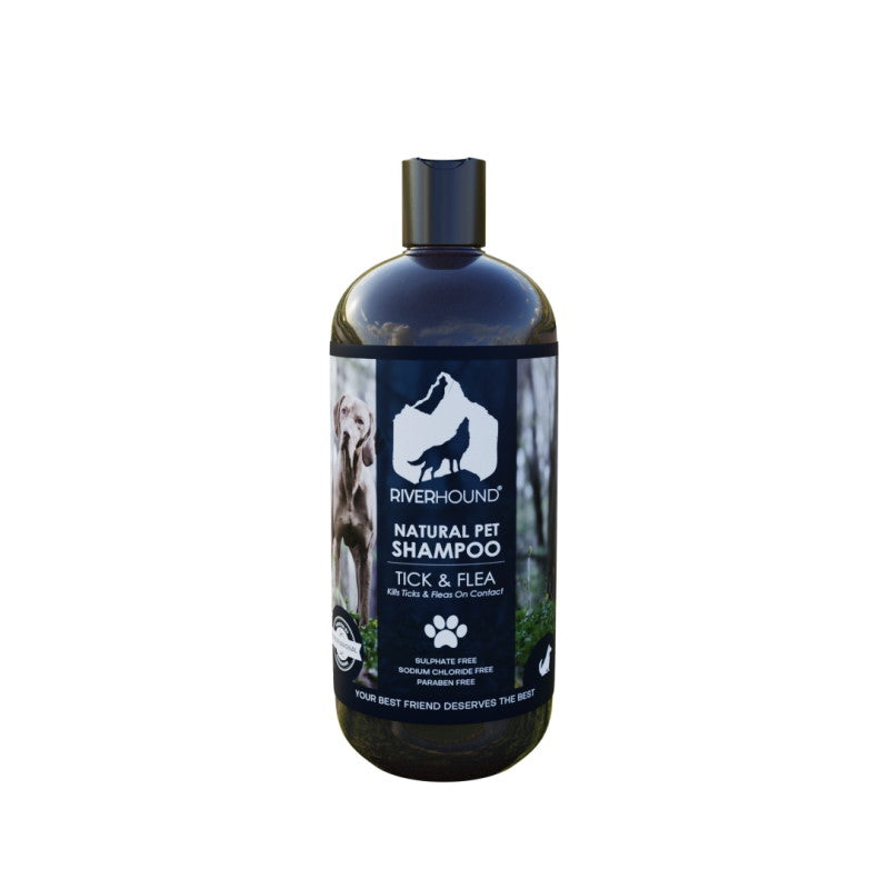 RIVER HOUND Tick & Flea Shampoo kills & repels ticks and fleas while eliminating egg infestations. Contains 4 highly effective essential oils that kill ticks & fleas while repelling them for up to 7 days. Use on dogs & puppies over 12 weeks of age.