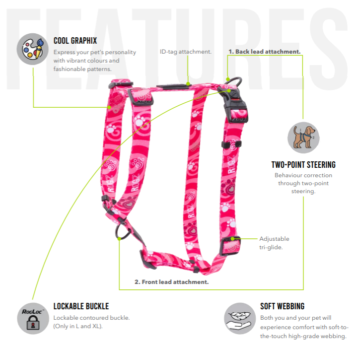 The ROGZ Fusion Classic Harness features a front chest lead attachment, enabling you to walk your dog using any of our Multi Leads, providing the added benefit of Stop-Pull Steering control. These harnesses are fully adjustable and durable, designed with vibrant patterns that will make you stand out from the crowd. Express your pet's personality with vibrant colours and fashionable patterns. Behaviour correction through two-point steering. Both you and your pet will experience comfort with soft-to- the-touch high-grade webbing. Lockable contoured buckle. (Only in L and XL).Available in