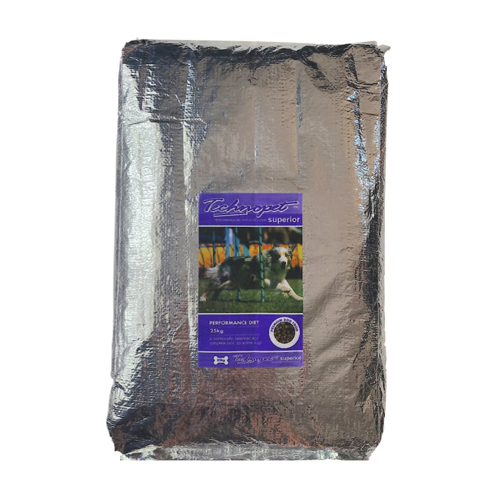 Technopet Superior Dog Food is a nutritionally balanced and complete performance diet for active dogs. The pellets are small and can be softened during early stage solid feeding, but a strong recommendation is to serve as a dry food for subsequent growth stages.