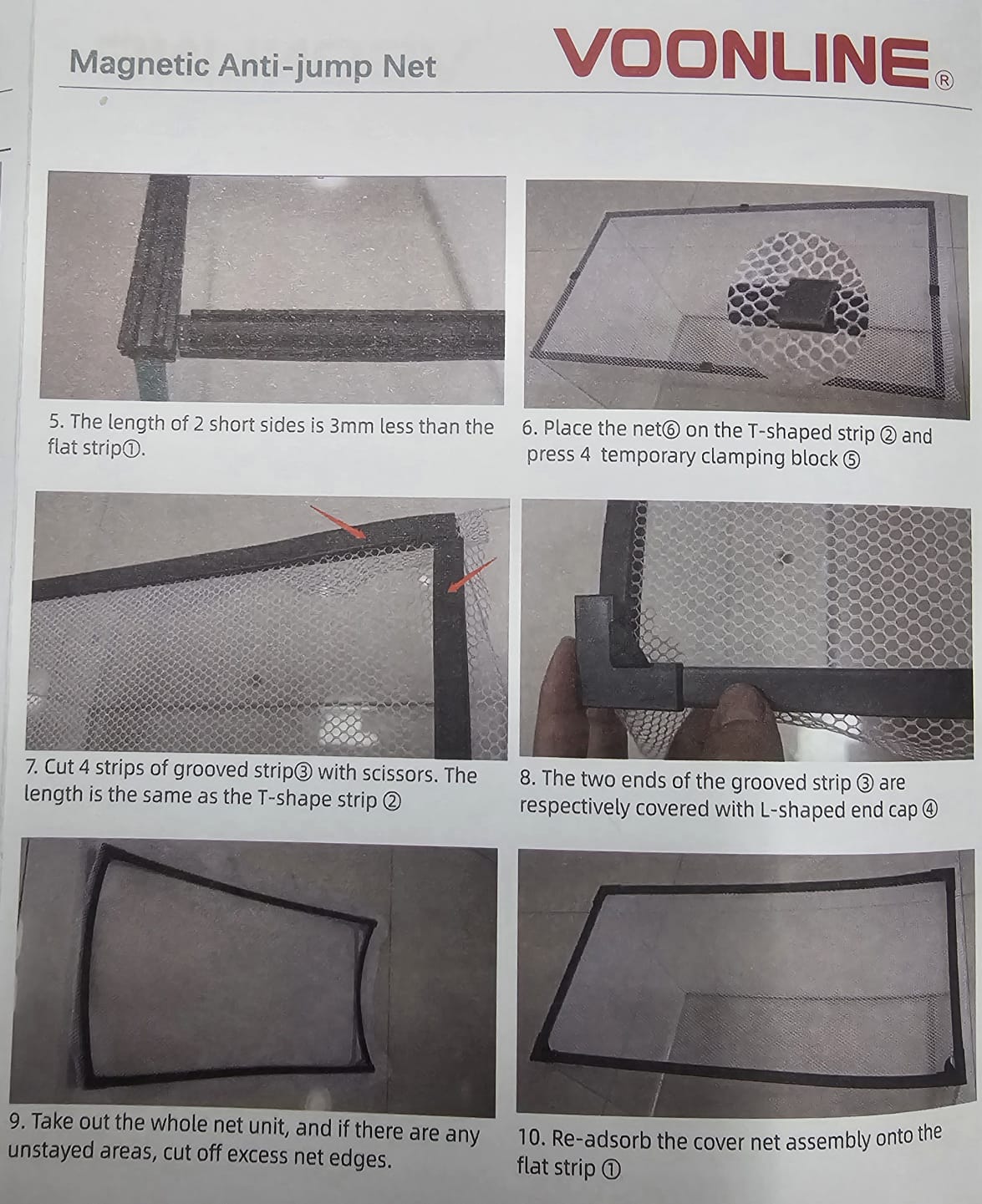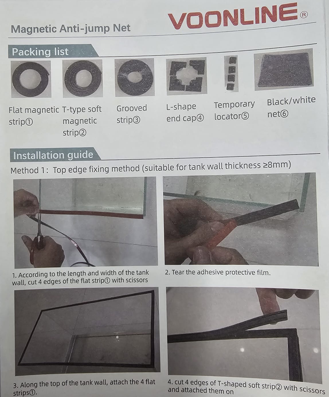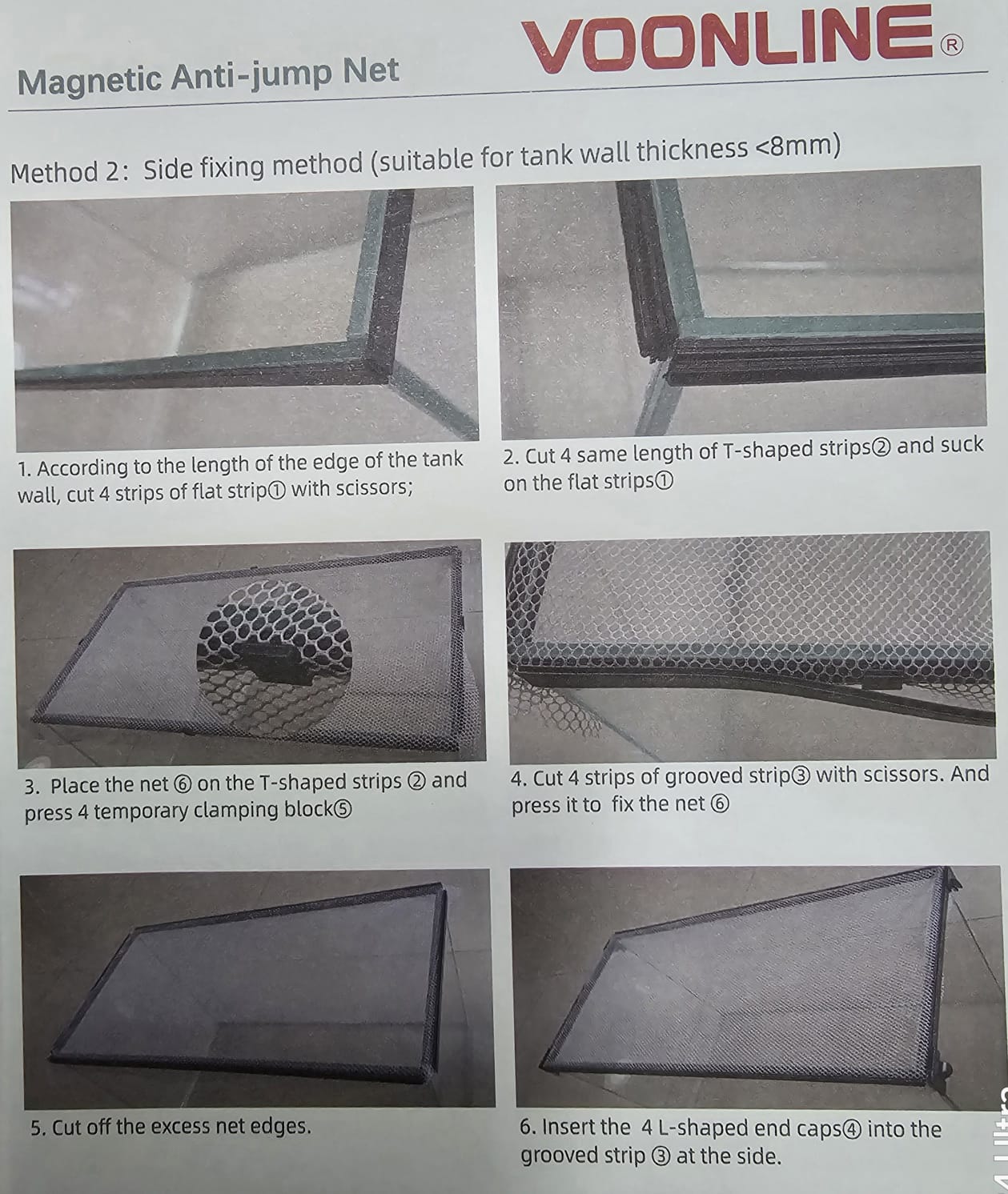 The Voonline Anti-Jump Net is designed to prevent fish or pets from jumping out of an aquarium without a hood. It is made with a magnetic frame for easy attachment and provides flexibility in fitting various tank sizes