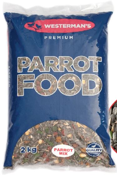 Premium Parrot Mix includes Striped Sunflower, Red Sorghum, Yellow Maize, Parrot Biscuits, Oats & Unshelled Peanuts