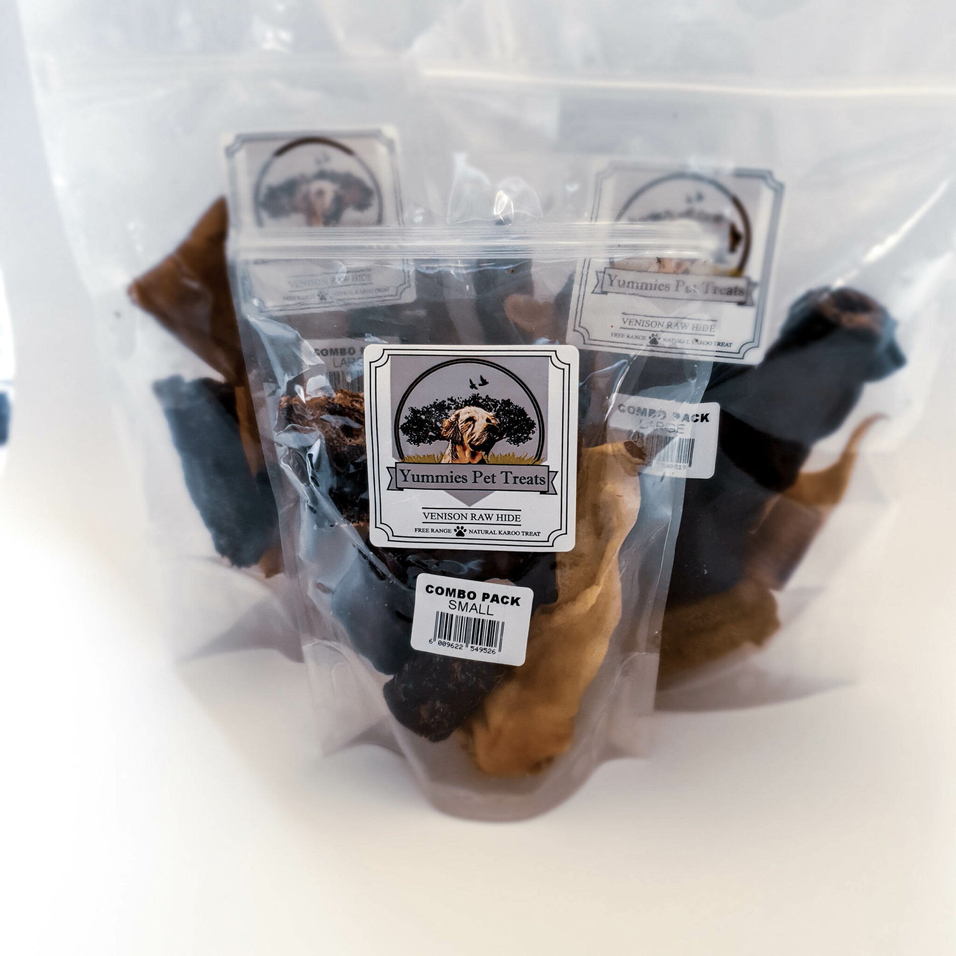 Combo small is a combination of all our different off cuts. Yummies Venison hide is made with love and care. Chews are meant for treating boredom and/or teething.
